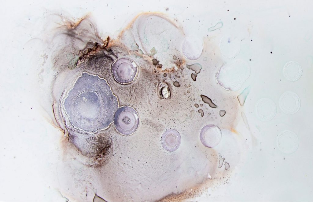 Karissa Gannon hopes her works create a pause that signals everyone to collectively stop and take a breath. Her series employs alcohol ink to create compelling petri dishes as paintings. Her work is reflective of this past year—2020—which Gannon characterized as overstimulating in many facets. She has used her work as a way to soothe herself, and by extension provide a sense of relief to her viewers, whom she hopes can walk away with that feeling fully absorbed. Gannon received her BFA from Mason Gross School of Arts at Rutgers University. She displayed in several solo and group exhibitions, primarily in the New Jersey area. Along with creating art, she has a taught cartooning, drawing, other art, and English.