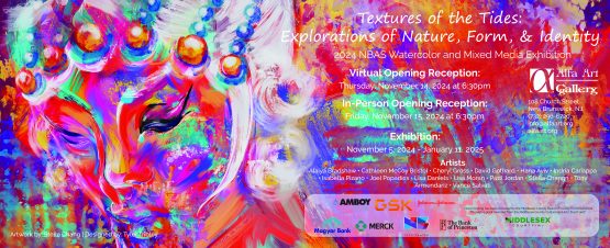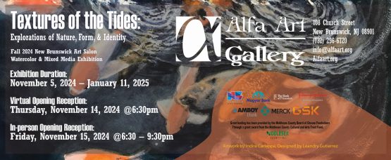 Virtual Opening Reception : Thursday, November 14,2024 6:30pm Alfa Art Gallery invites you to immerse yourself in a vibrant collection where nature’s rhythms and the complexities of human identity converge.”Textures of the Tides: Explorations of Nature, Form, & Identity” is the newest exhibition in Alfa’s New Brunswick Art Salon (NBAS) program that has spanned over the past fourteen years. The featured artworks explore the fluidity of watercolor and mixed media, capturing the interplay between the natural world and personal introspection.…