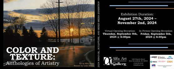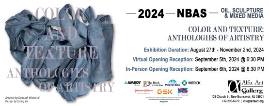 New Brunswick, NJ — Alfa Art Gallery Presents the Summer 2024 NBAS Oil, Sculpture, and Mixed Media Exhibition Color and Texture: Anthologies of Artistry. The event is free and open from August 27 until November 2. Virtual Opening Reception: Thursday, September 5, 2024, at 6:30 PM In-Person Opening Reception: Friday, September 6, 2024, at 6:30 PM Color and Texture: Anthologies of Artistry Virtual Exhibition: Click on the images (artwork and graphics) to bring up an information text box…
