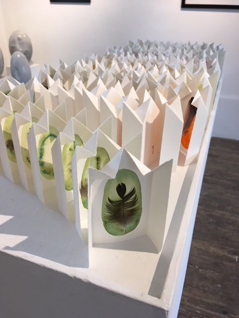 Betty Jacobsen is an artist and educator, trained at NYU and Montclair State University. She teaches advanced art classes at Hunterdon Central Regional High School. Her passions are art and nature, coupled with education, with nature serving as a personal metaphor for the cycles of life. Starting from observations of nature, her work flows from the unconscious; it is quietly intimate in size. Her small works can stand individually yet create a larger visual statement when viewed together. The repetition and relationship among parts is exciting, as each series explores an idea through consistency of size and media. Humble materials such as paper, watercolor, sewing thread, feathers, and pen have worked their way into three-dimensional pieces through folding. For the work shown here, called The Walk, Jacobsen used tiny bird feathers to create 100 paper triptychs.