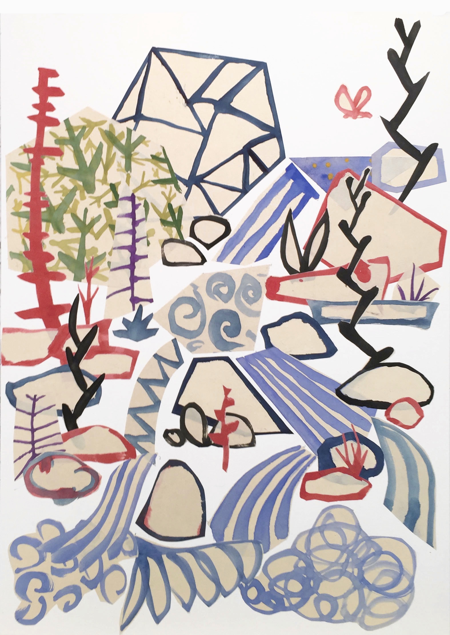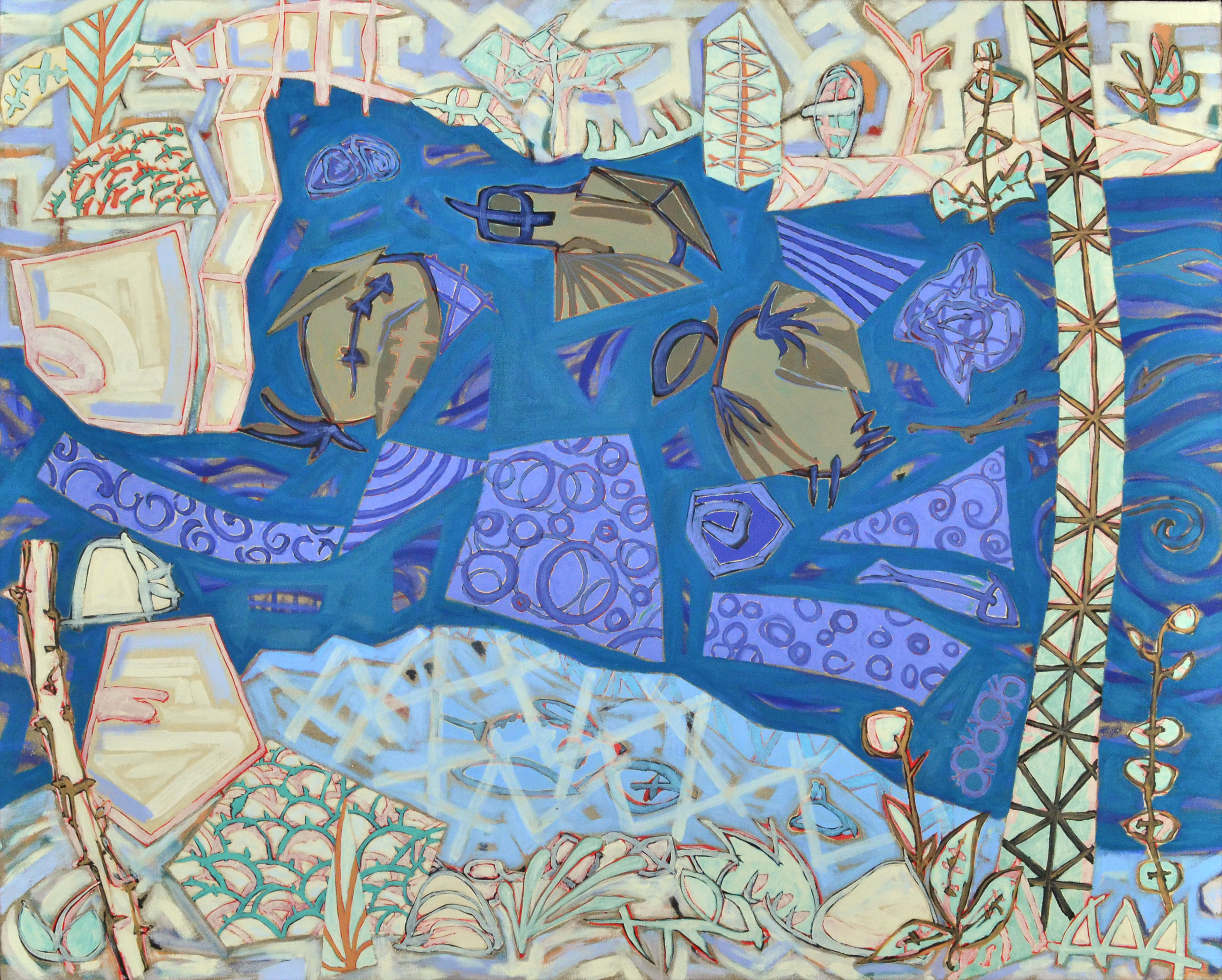 When an idea or image captures my imagination, I save it in a sketch. If an idea has potential, I develop it using more sketches and collages. I use collage as a means for expression and discovery, it helps me find what I otherwise might not imagine. Using ink and watercolor on rice paper fragments, I build a vocabulary of abstract parts. The parts are used to find images and build a composition. Each image is the product of many decisions. By making choices I find and express myself. I value honesty and transparency as I make these choices. I favor intuition, improvisation and accidental discovery while composing. As the image develops the parts are glued into place to form a structure for the painting. The collage may be part of a painting or the subject of a painting.