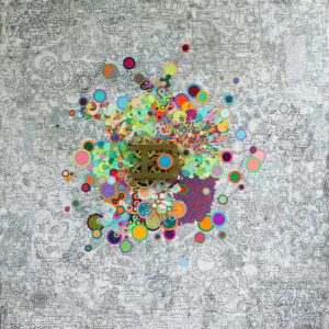 Viewers may not know what to focus on first, becoming overwhelmed and subsequently absorbed in the details. The experience is reminiscent of mediation. Certainly, working on these pieces in the studio is a meditative, flow state way of being, where Chalfen can take his time to think about and explore through art-making themes of nostalgia, anxiety, play, musicality, fragility, impenetrable data, accretion and erosion, and physical and psychic fragmentation.