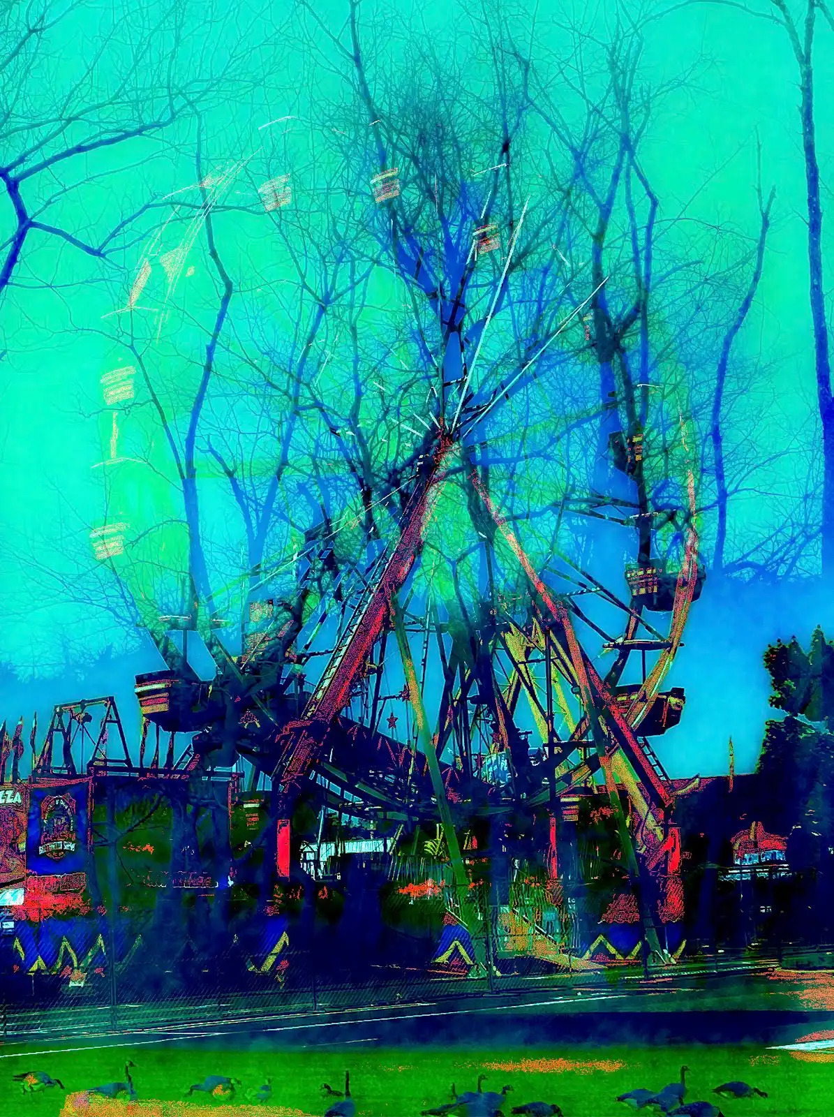 For Hallas, the environment provides the material that he transforms into an immersive world. Through disorienting color and collage techniques, he synthesizes familiar landscapes into dreamscapes of survival. His captures explore the relationship between the eye and technology, while opposing the tradition of photography as a medium for objective truth. Overall, Hallas provides an escape through immersion in a psychedelic, yet familiar sublime.