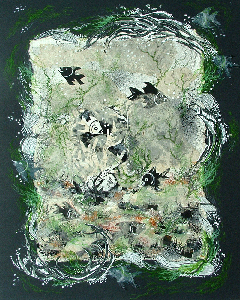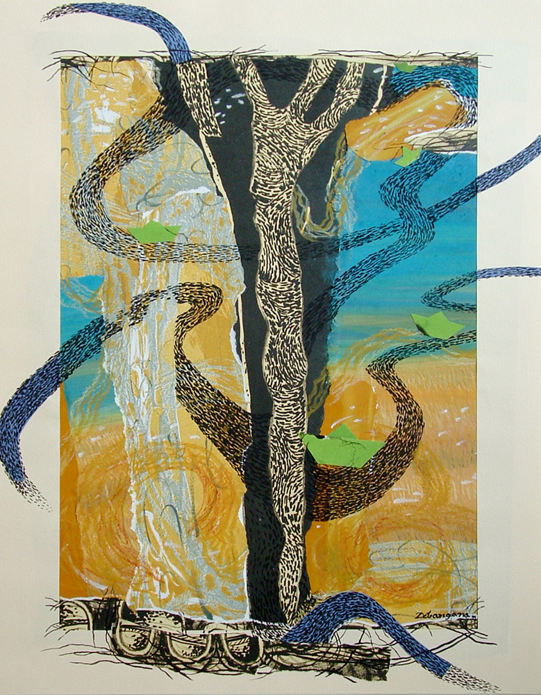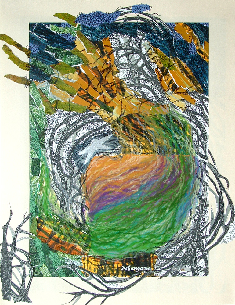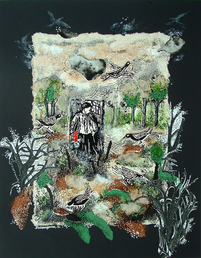 Debangana Banerjee is not only a visual artist; she is also a board member of the San Marcos Area Arts Council in Texas. She earned her Bachelor of Fine Arts and Master of Fine Arts in Graphics/Printmaking in Santiniketan, India and then earned her Master of Fine Arts at Louisiana State University in Baton Rouge. She has earned National Scholarship and University Scholarship for her M.F.A. in Graphics as well as a silver and bronze medal at the “All Indian Art Contest and Exhibition” in Dhanbad. Banerjee has exhibited in several solo and group exhibitions in Texas, Louisiana, and India. She also co-curated an art exhibition entitled, “Shilpa: Colors of India-Pakistan-Bangladesh,” at Walkers’ Gallery in San Marcos. In addition to graphics and printmaking, Banerjee has published her poetry and short stories, designed covers for books, and narrated a documentary film. In her free time, she has volunteered at the Wittliff Collections archive at Texas State University and at the Public Library in San Marcos. Her works are about her journey through life and reflect her experiences in both India and the United States. Originally from Santiniketan, India, the philosophy of India’s national poet, Rabindranath Tagore, has deeply moved her as an artist. The earthy, dark colors of her works reveal the poet’s view on the relationship between human beings and nature. This artist’s hardships and successes have been exposed through her art, in which she shows her journey of self-exploration through the emotional tension within her works.
