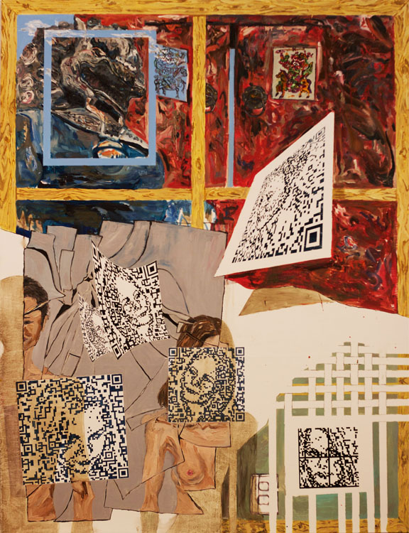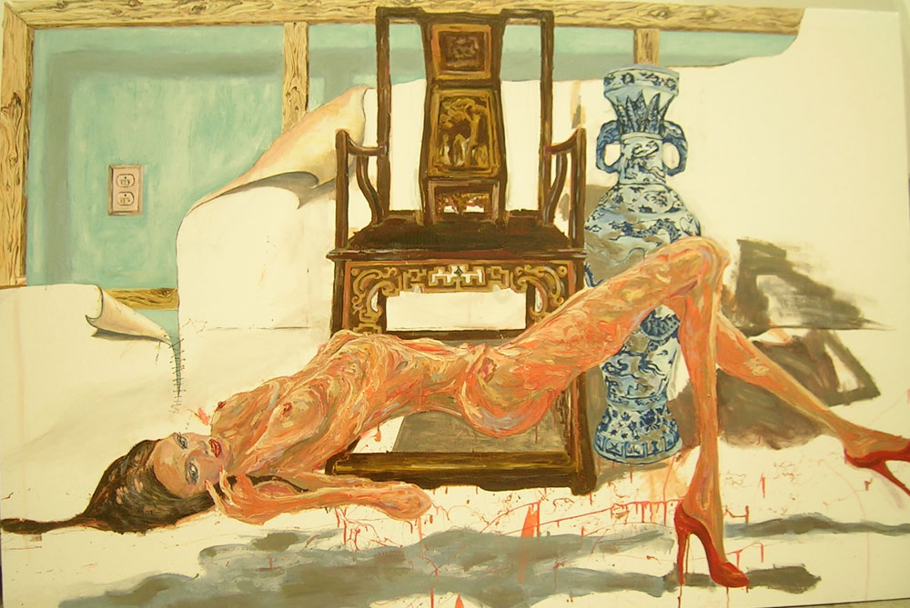 For this purpose, I am developing a visual vocabulary to encourage the viewers’ engagement into my painting. In my paintings I explore the integration of the physical plane of painting and virtual space created by the artist. The painterly language is to demonstrate the triple properties of a painting’s dimension: the space behind the pictorial plane, the physical existence of the painting surface per se, and the space in front of the pictorial surface, where the viewers are embodied. The painting is no longer an untouchable virtual window on the wall. It has been conceptually transformed into a frozen clip of a performance art (instead of traditional figurative art) or an installation art (instead of traditional still life painting). By doing this, I am trying to reveal the union and discrepancy between the time  and timelessness, as well as the space and spacelessness.