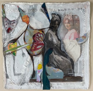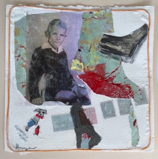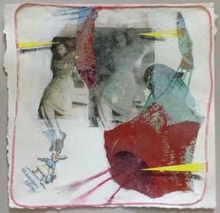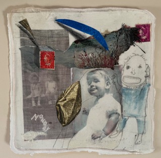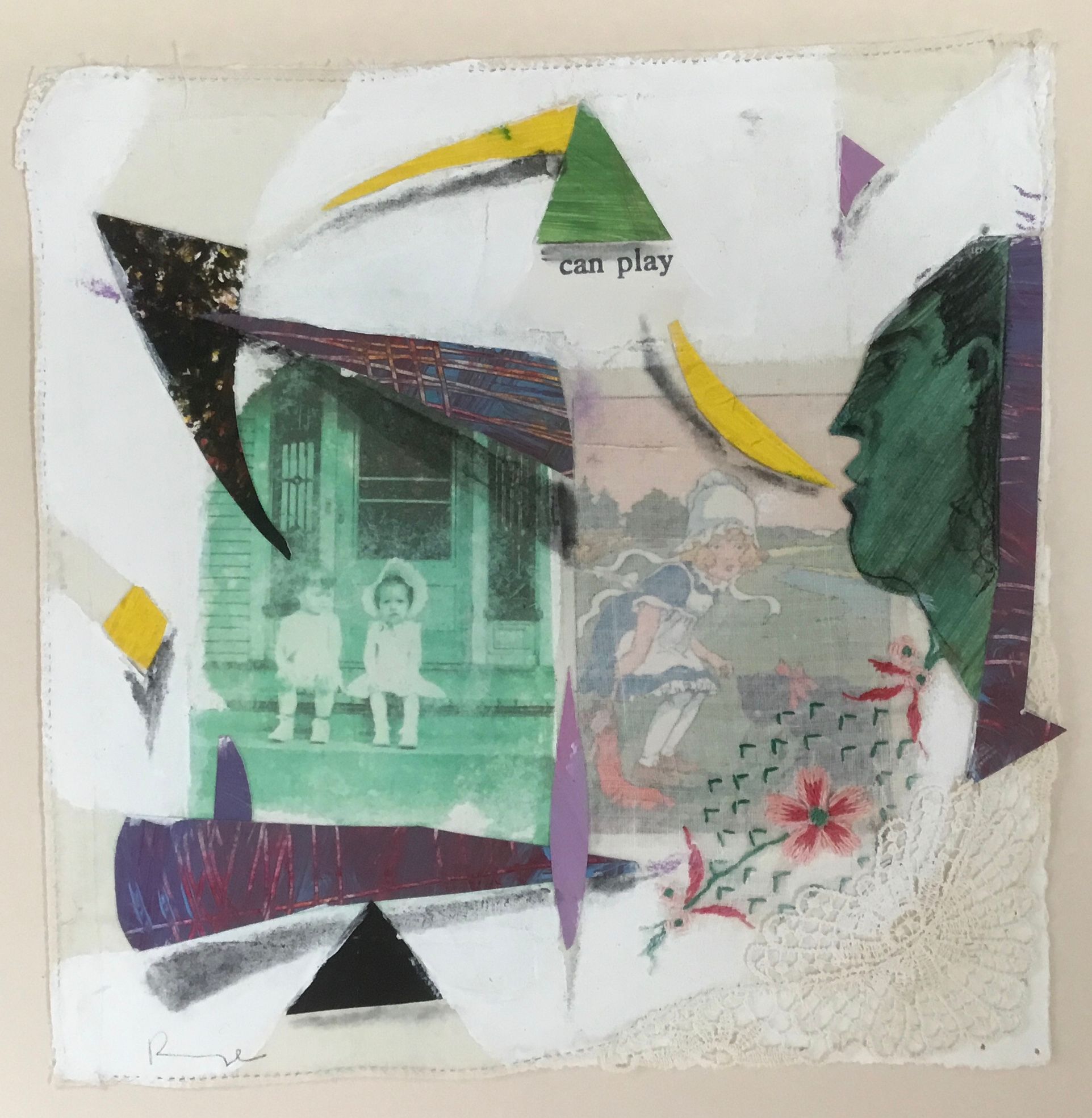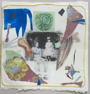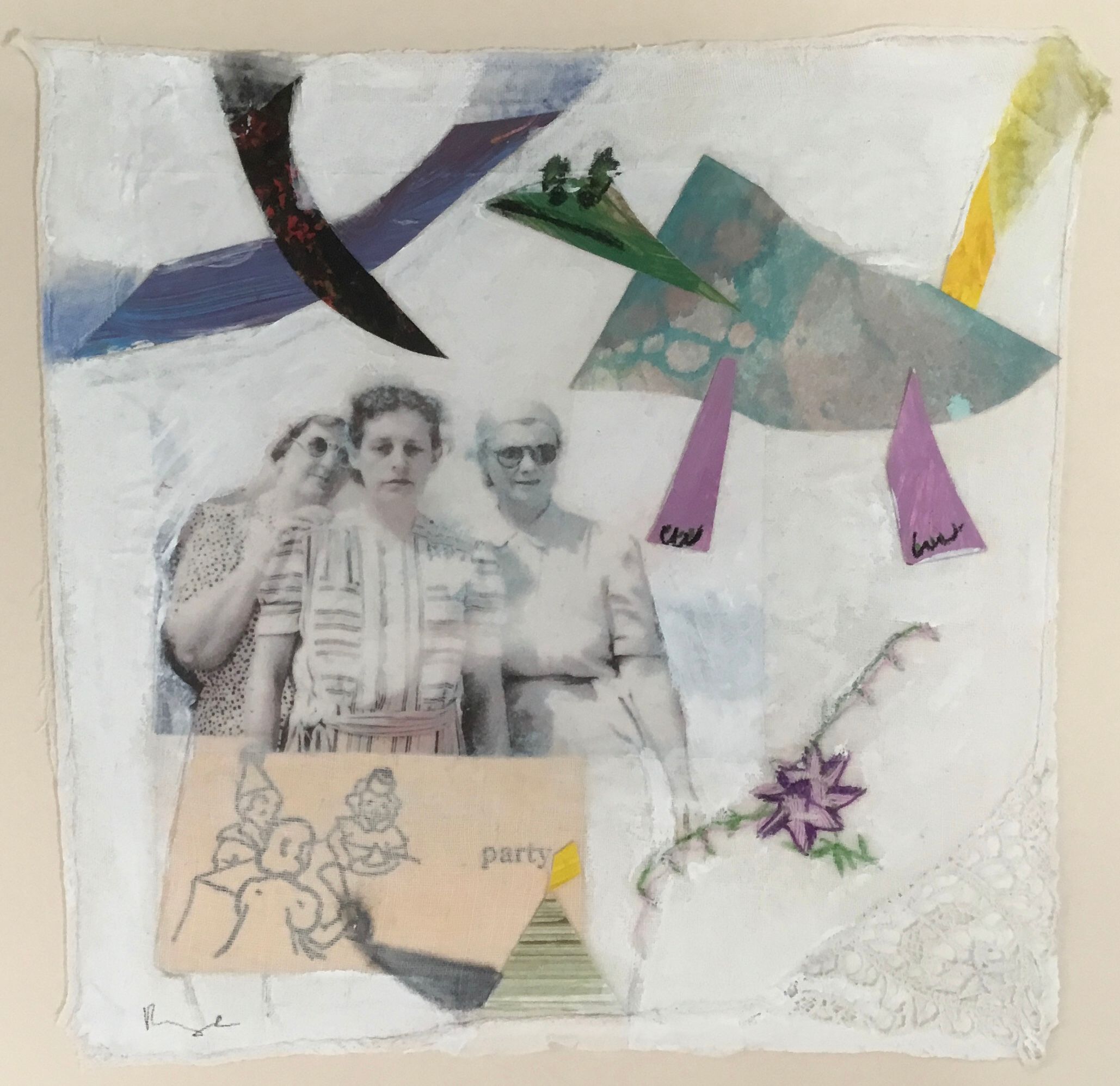 My work is an elegy to all the ephemera in my life. I layer printed papers such as almanac pages, dictionary excerpts and cast-off artwork with my own drawing and painting. The materials and I are storytellers in a visual world. I include text to imply sound within the visual silence and express time by the type of font. In the last few years, my work has taken on a biographical nature by using image transfers of old family photographs or the photographs themselves. Repeating images, shapes, and colors in layers, I create a composition that floats through time and space.