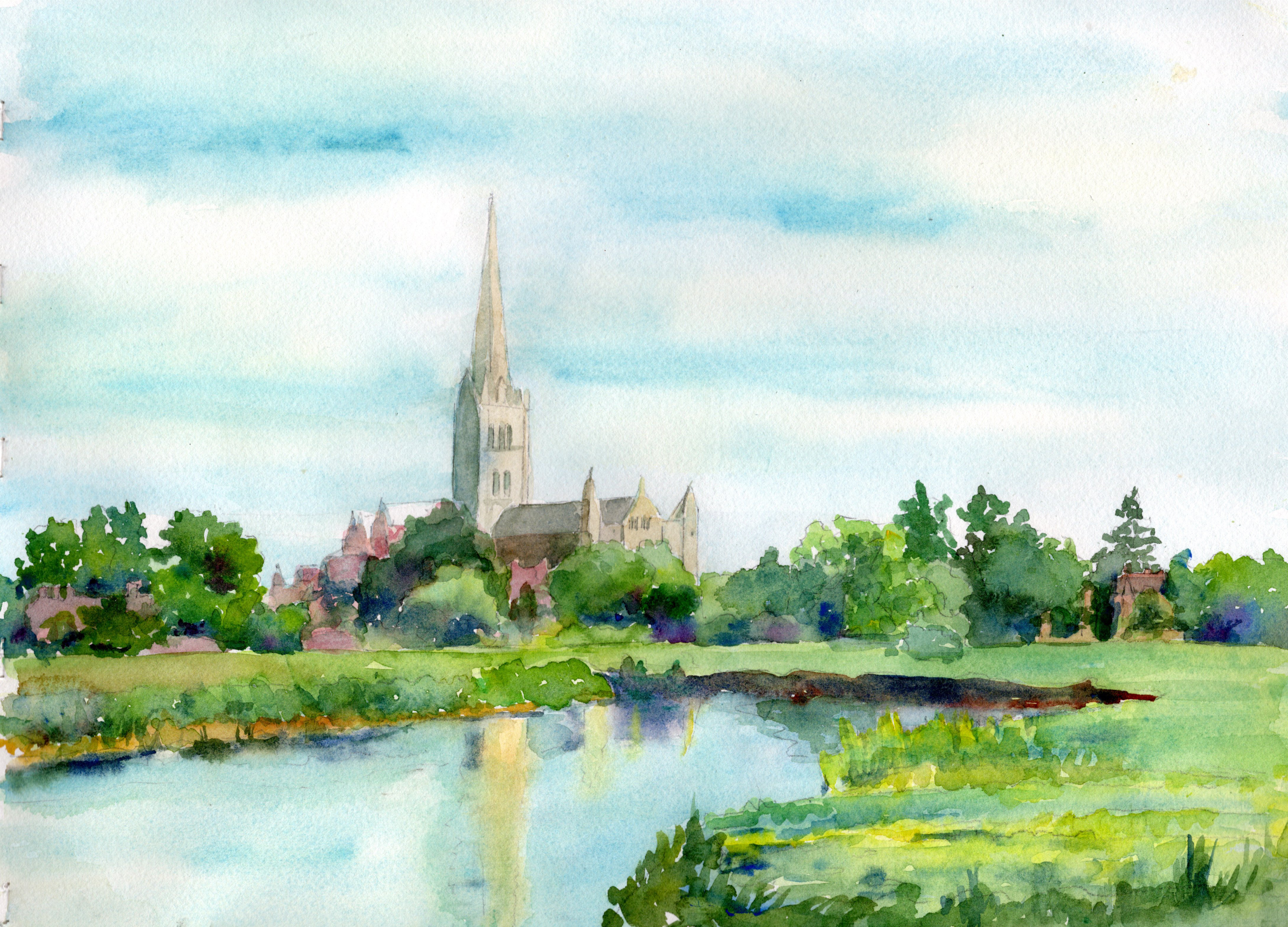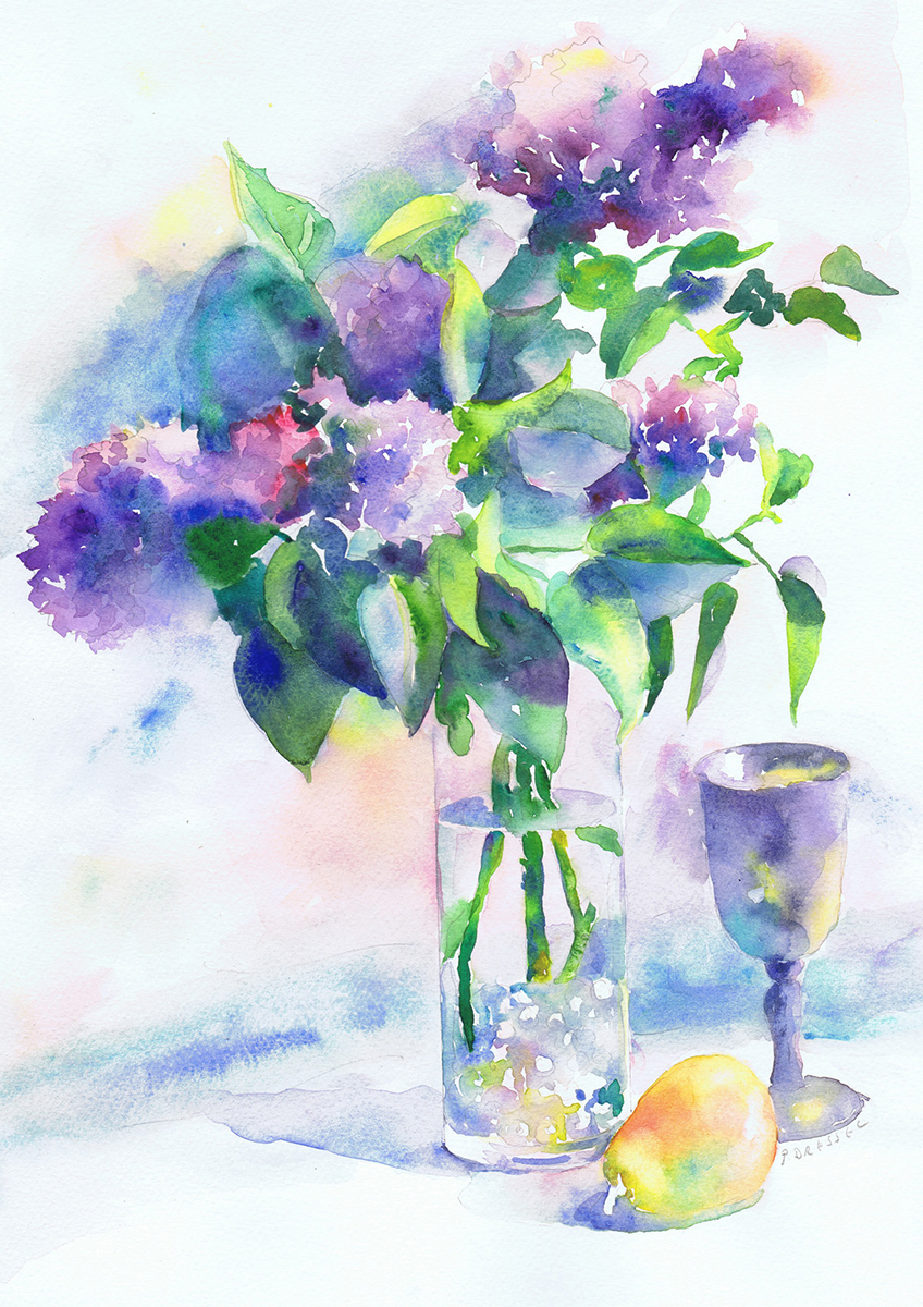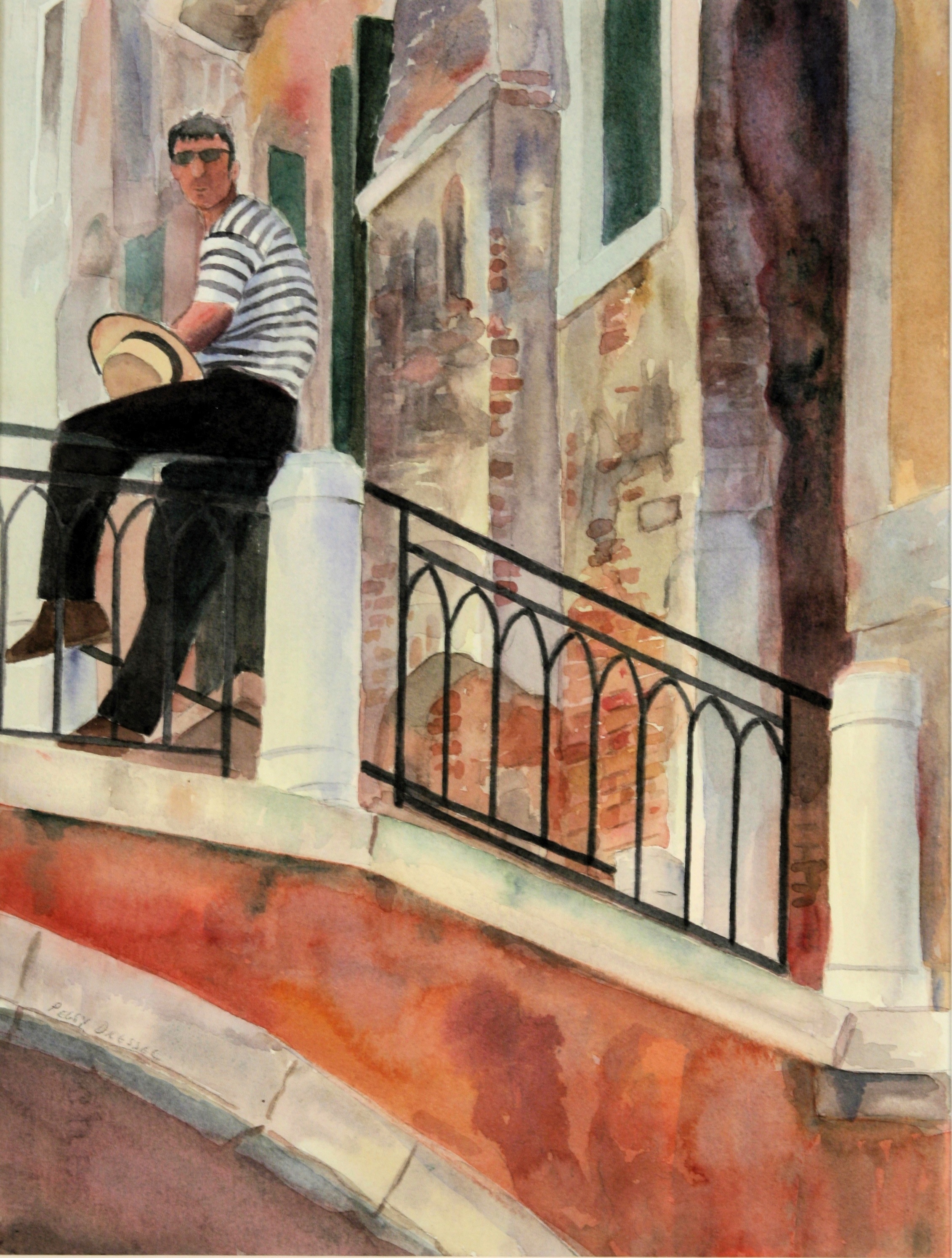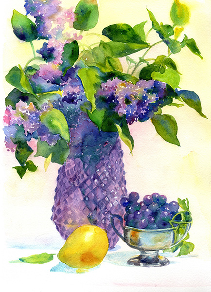 “I love painting with watercolor. It is the perfect medium to create beautiful and colorful paintings. I use transparent washes of changing complimentary colors. This helps to vibrate the color and produces a luminosity and glow in my work. The sense of light and value in my paintings is also important to me. It conveys mood, place and time of day. “