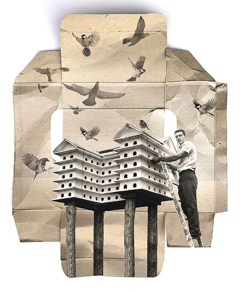 The implied act of opening the boxes, releases the occupants, allowing them to take flight. The people and objects confined within, through the simple act of unfolding, are exposed revealing what was previously hidden.