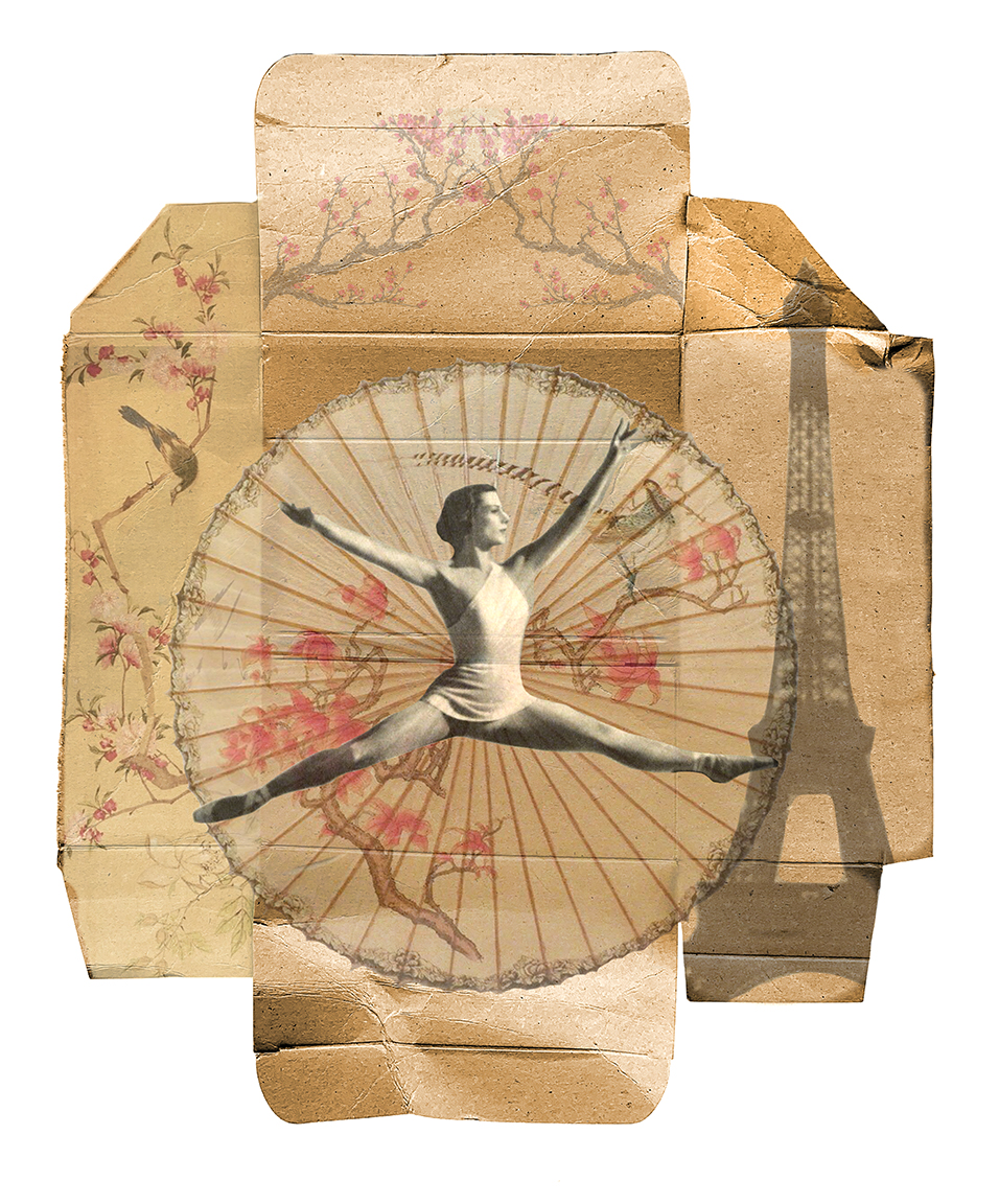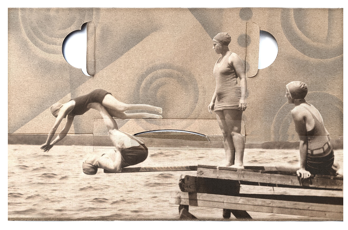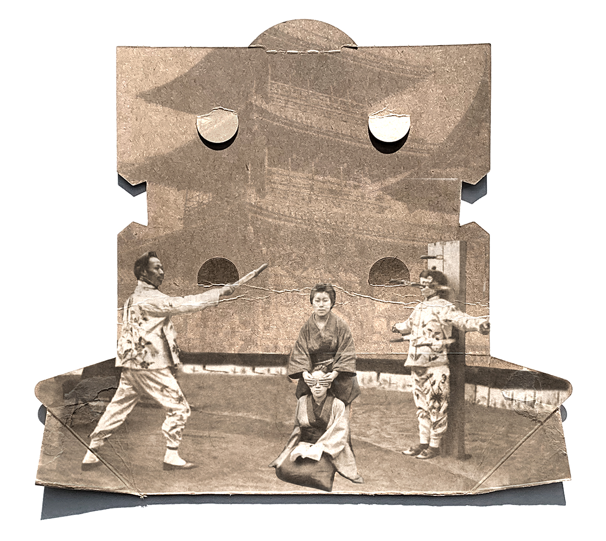 The sense of nostalgia evoked in the graphic synthesis of these images is augmented using a wash of warm sepia tones that permeate the images. There is also a visual correlation between inhabitants of the boxes and the boxes themselves. The folds of the boxes having a quality not unlike origami, is reflected in the contortionist-like bending of the human forms within.